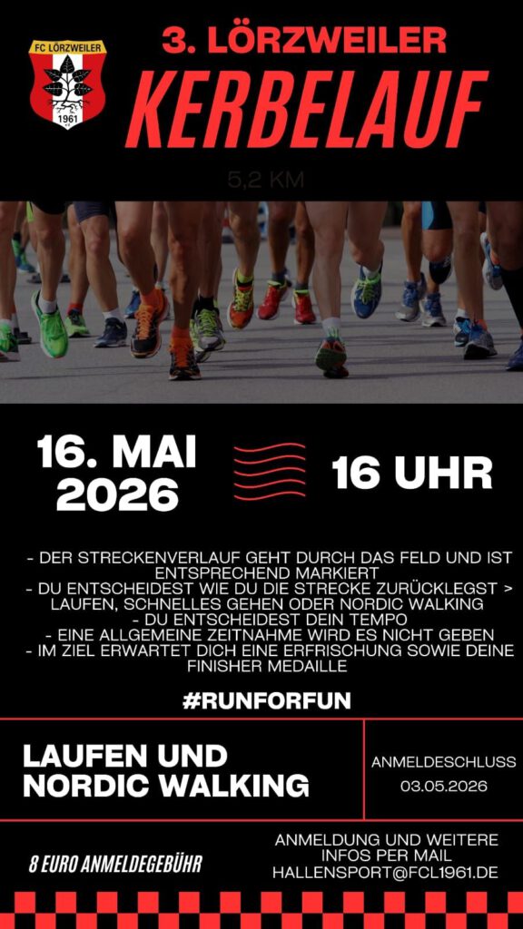 Wir freuen uns über jede Anmeldung aus nah & fern.🏃🏻👟😃 Laufen & Nordic Walking, Anmeldegebühr: 8,00 €, Anmeldeschluss: 3. Mai 2026 – Anmeldung per E-Mail an: hallensport@fcl1961.de