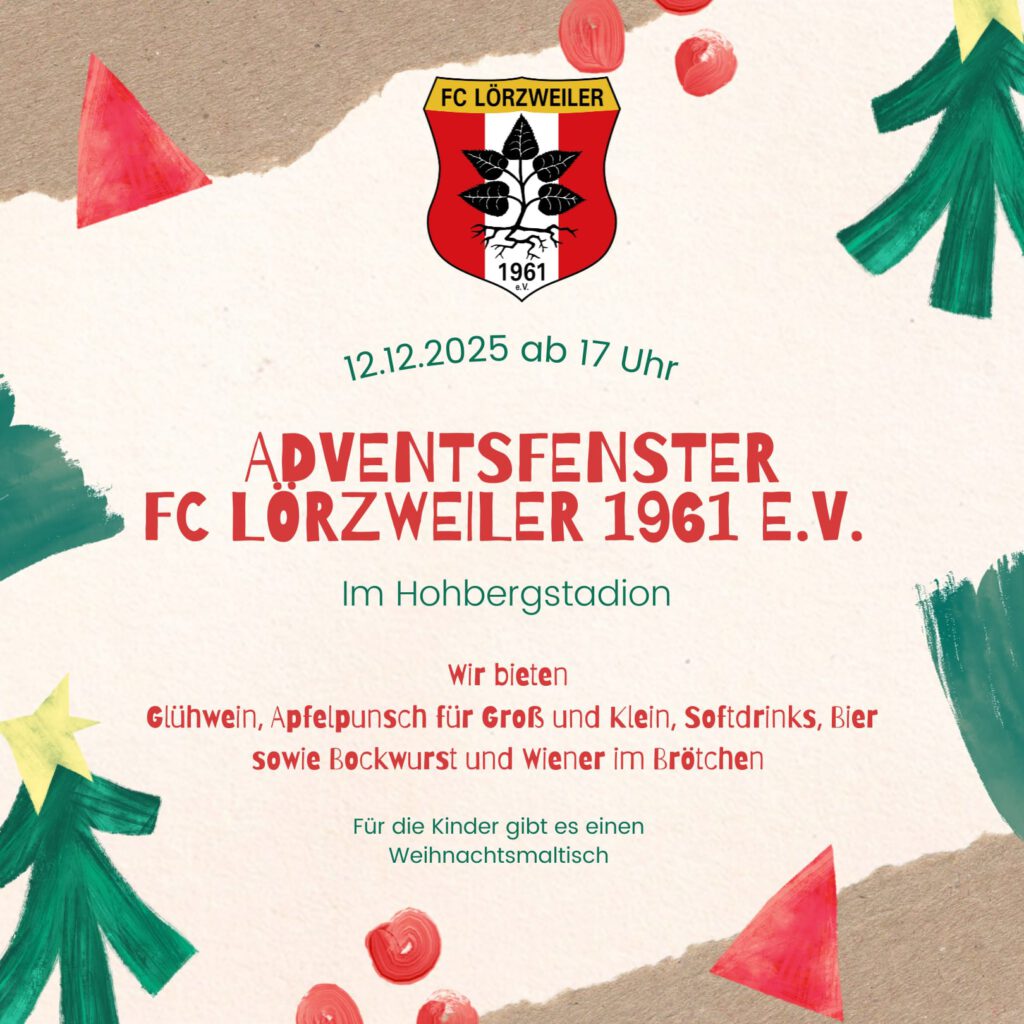 Auch dieses Jahr darf der FC Lörzweiler bei seinem Adventsfenster besucht werden. Kommt am Freitag, 12. Dezember ab 17:00 Uhr bei uns am Vereinsheim vorbei. Bei uns wird es Glühwein, Apfelpunsch für Groß und Klein geben, Softdrinks, Bier, sowie Bockwurst oder Wienerli im Brötchen.